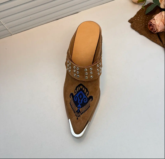 Leather summer wear semi-drag thick heel Baotou rivet embroidery temperament sandals